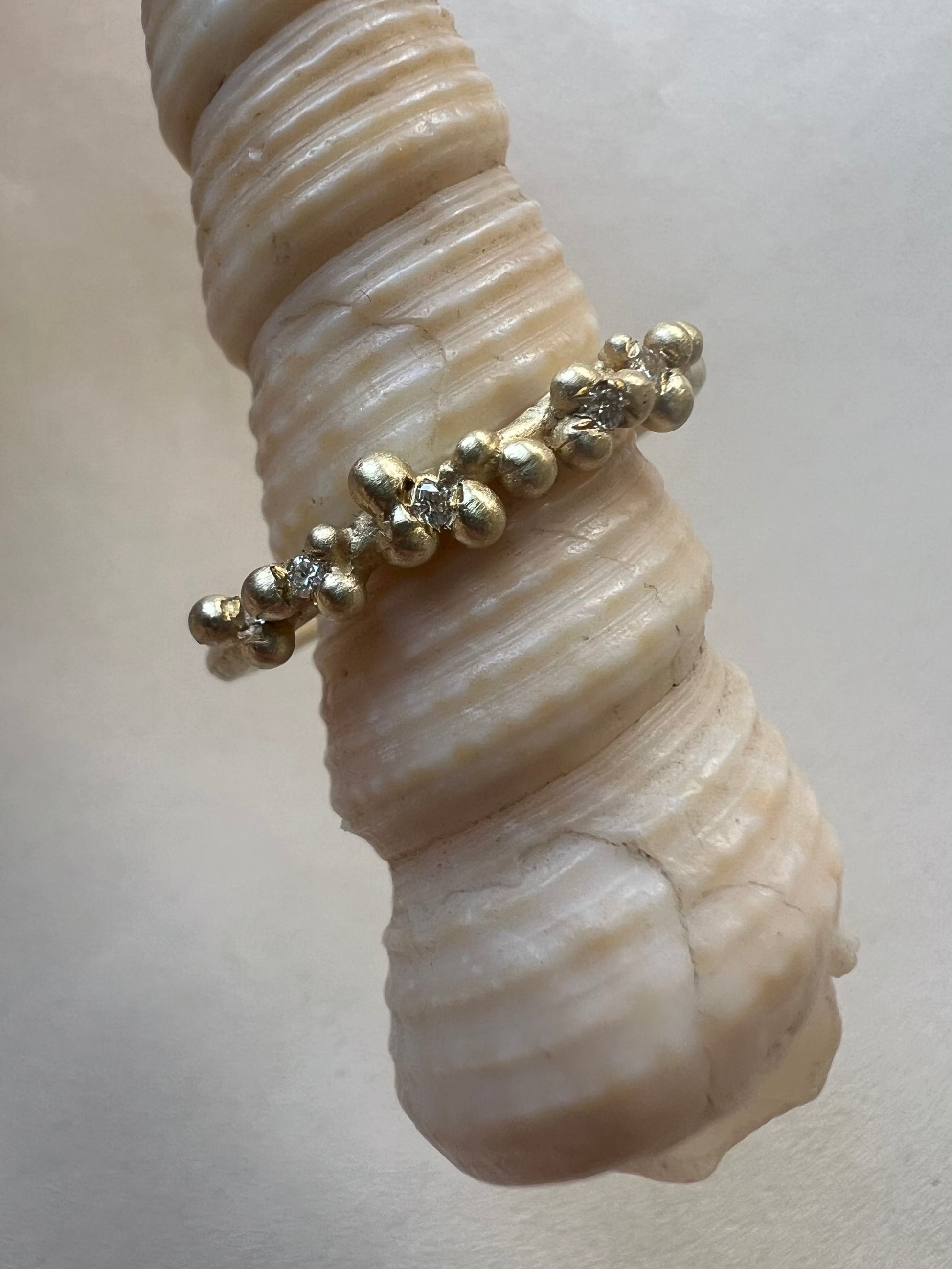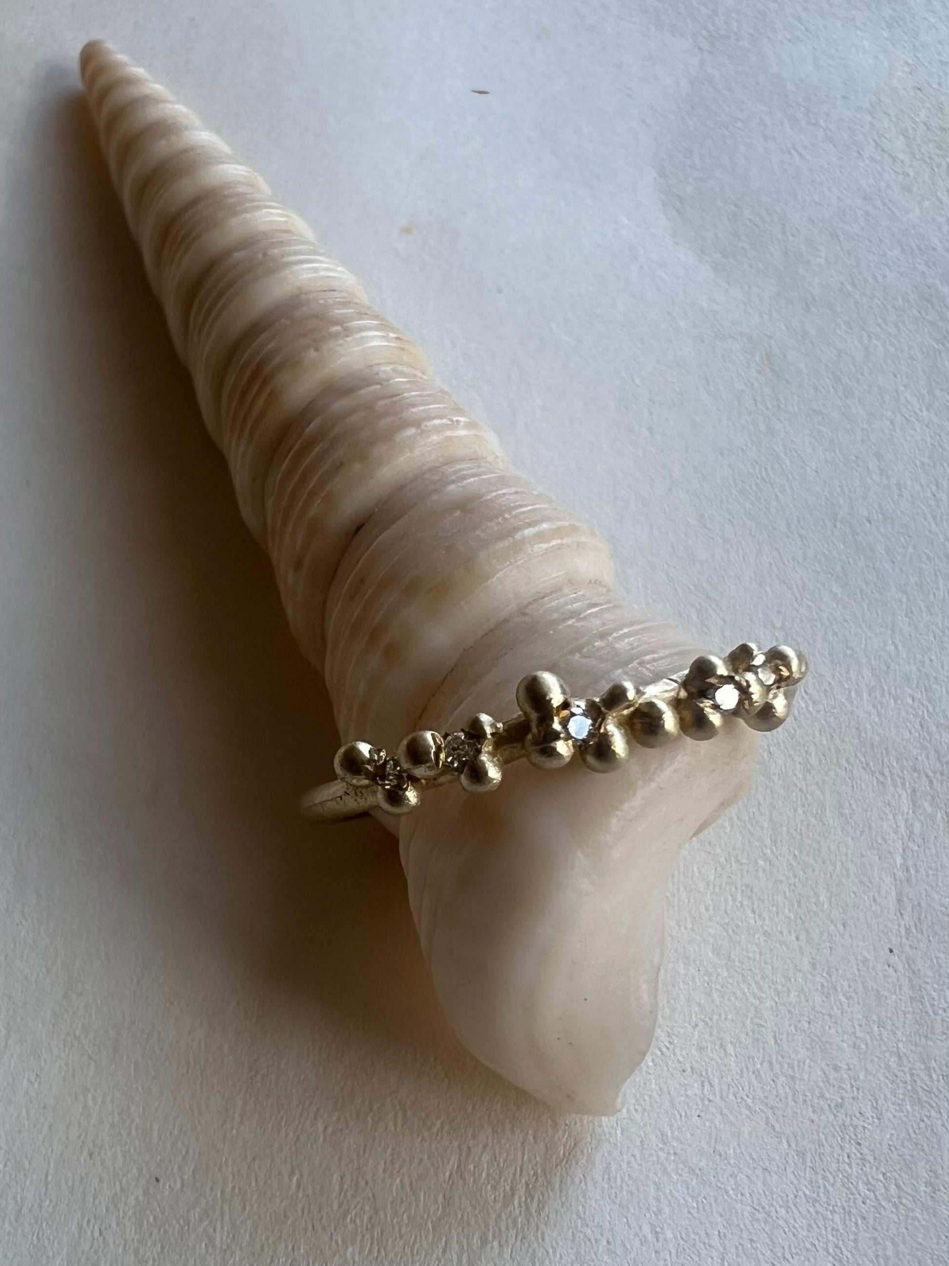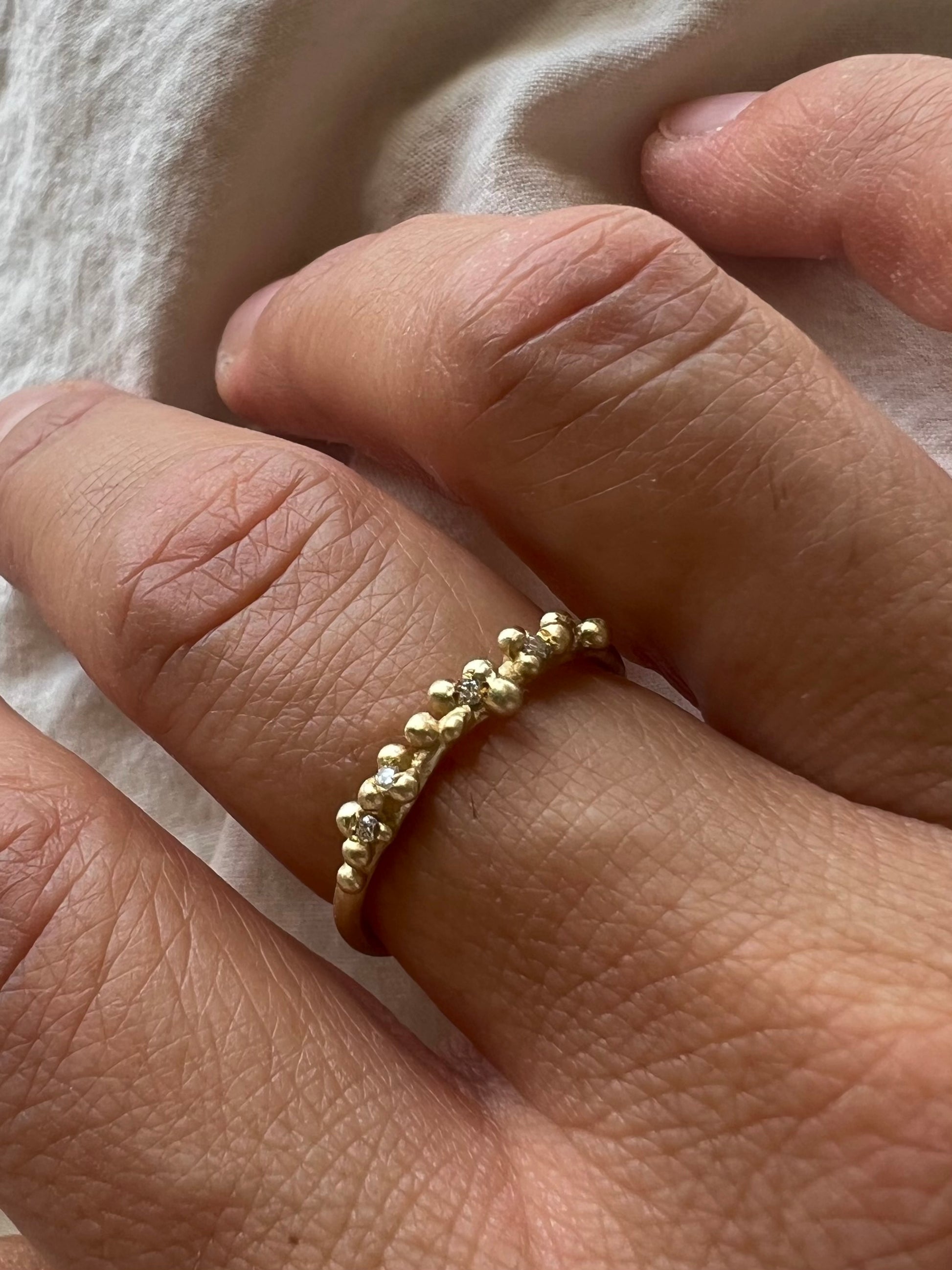 Featuring 0.1 carat 5 diamond set pearls ring, our elegant gold ring adds a touch of sophistication to any outfit. With a dainty 1.4- 1.5mm band, it can be worn alone or stacked with other rings for a bold statement. Elevate your style with this timeless piece.